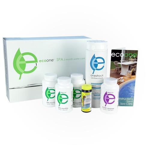 The ecoone Three Month Kit includes 3 bottles of Spa Monthly, 1 bottle of Filter Cleanser and 1 bottle of ONEshock hot tub shock. Using Spa Monthly regularly will help stabilize your hot tubs pH and alkalinity and reduces and/or eliminates skin and eye irritation. One bottle of Spa Monthly is added each month and each bottle of Filter Cleanser will last for up to 15 filter cleanings. One bottle of ecoone Oneshock has appromately 68 pre-measured shock packets. ecoones highly concentrated products require less products to be added to your hot tub for an easier to maintain hot tub experience. Includes a free bottle of AquaChek Test Strips (10 Strips).