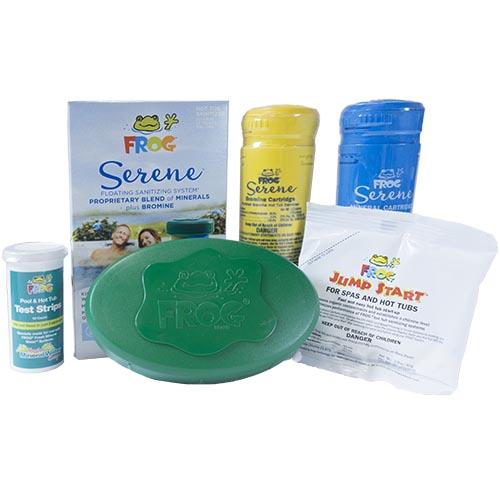 Spa Frog Serene Floating System uses pre-filled mineral and bromine cartridges that snap into a reusable floating holder and work in any spa. Spa Frog Floating System transforms your spa into the perfect environment for soothing relaxation using up to 50% less bromine.